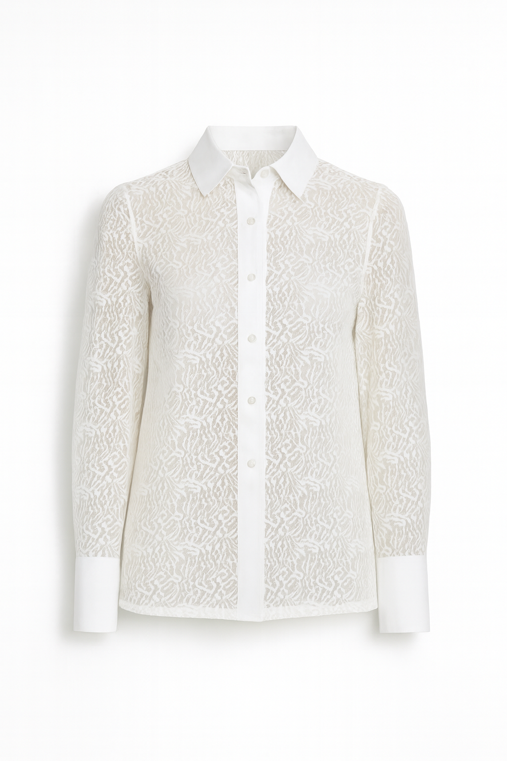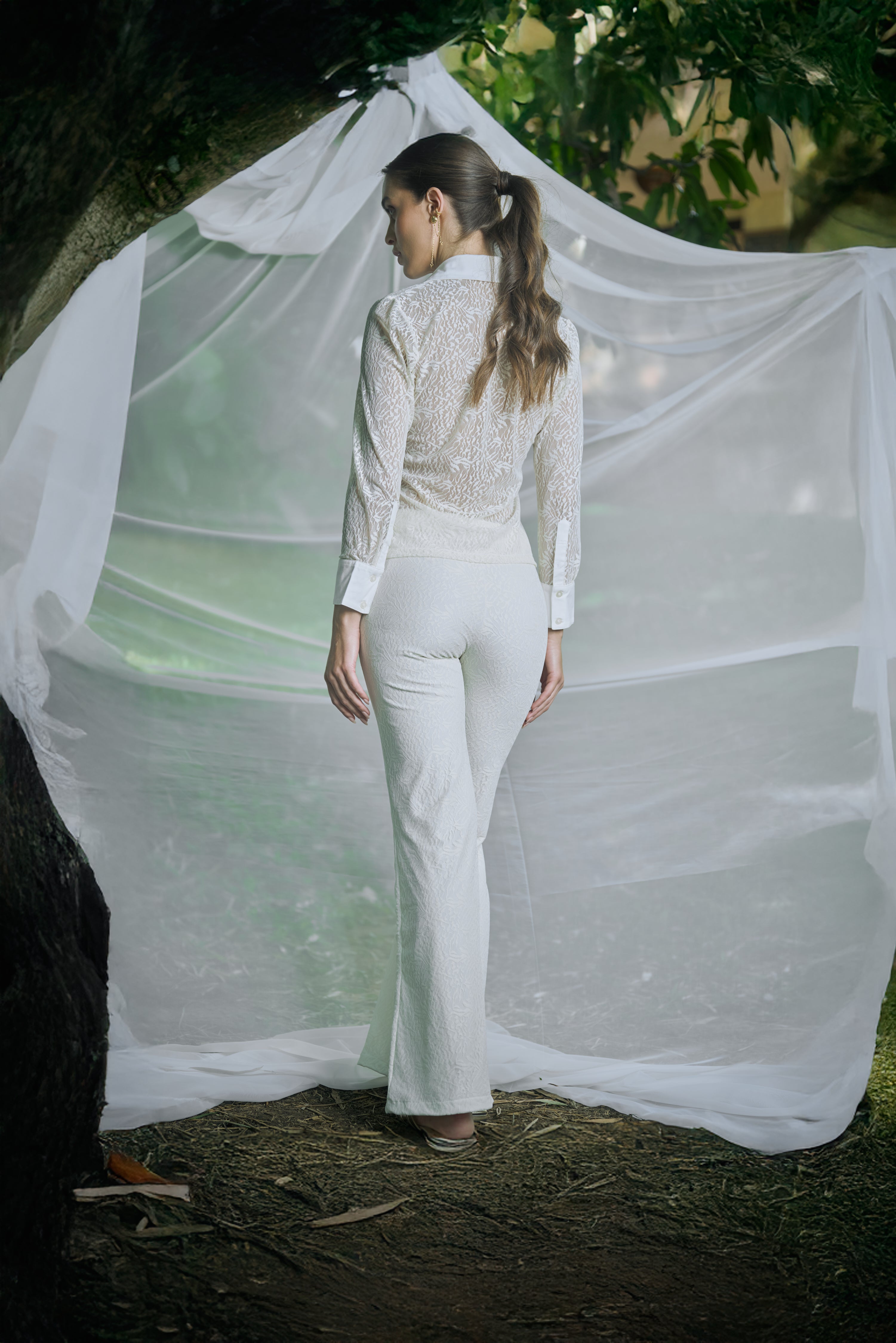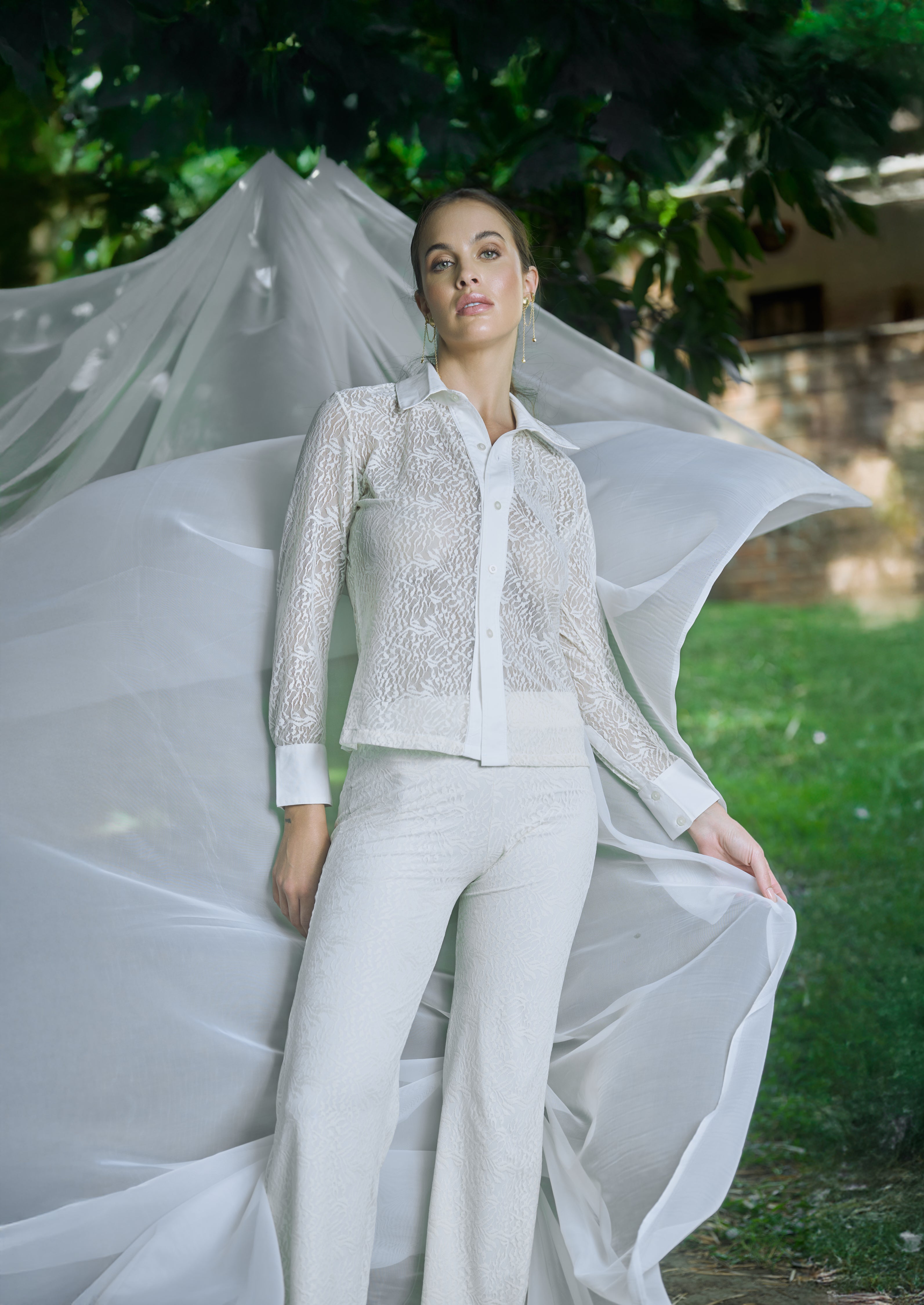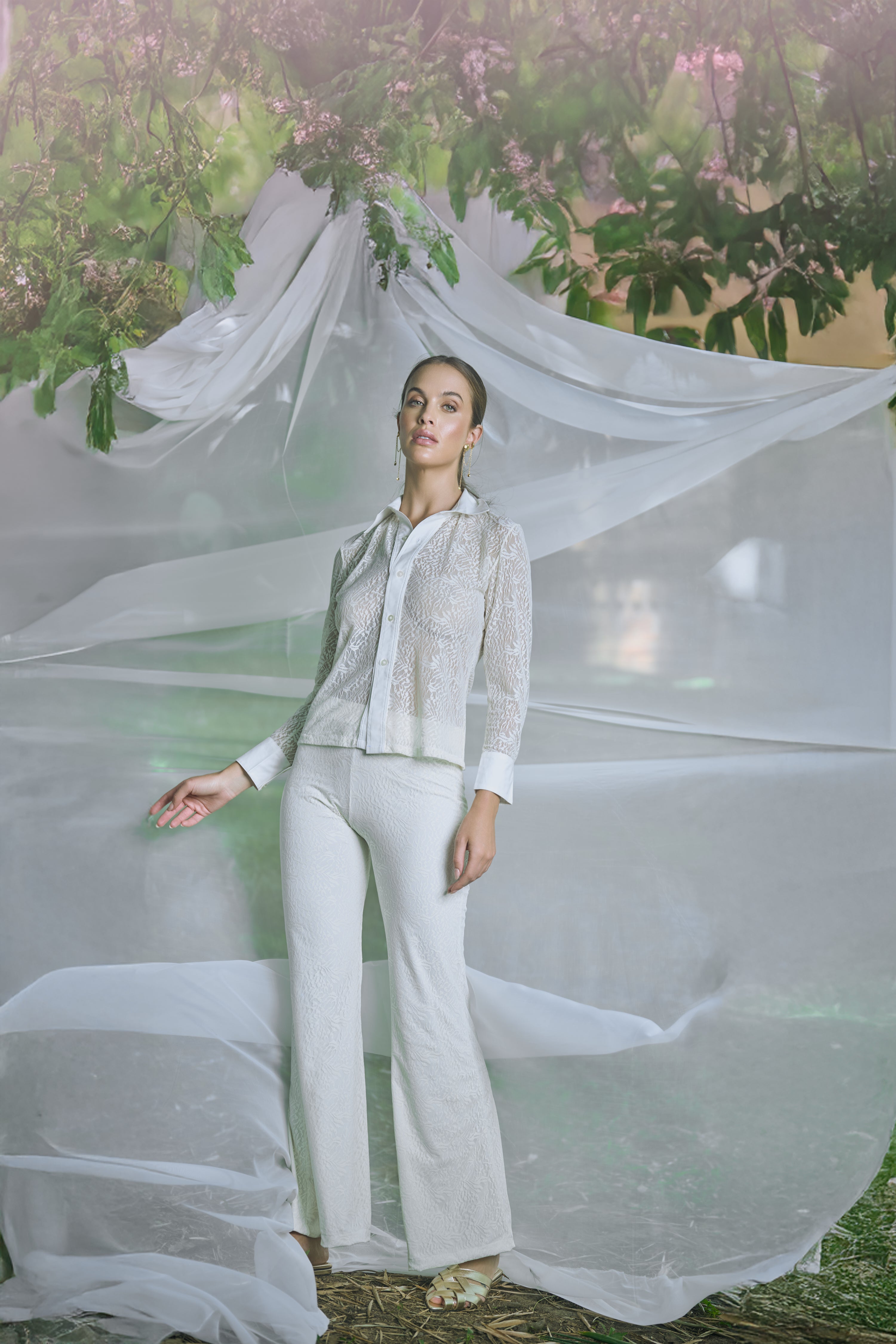 Camisa en encaje marfil, semi-transparente con elasticidad, con cuello clásico y botonadura al frente. Puños y tapeta en tejido liso  en algodón, que enmarcan el diseño. Femenina y elegante para elevar cualquier look. La modelo usa talla S. Hecho en Colombia. Características: Silueta recta, manga larga. Encaje con textura vegetal (semi-transparente). Cuello camisero y cierre de botones. Puños y perilla en contraste liso. Ideal para llevar con top de lenceria, blusa de tiras básica debajo y pantalón del miso encaje o pantalón.