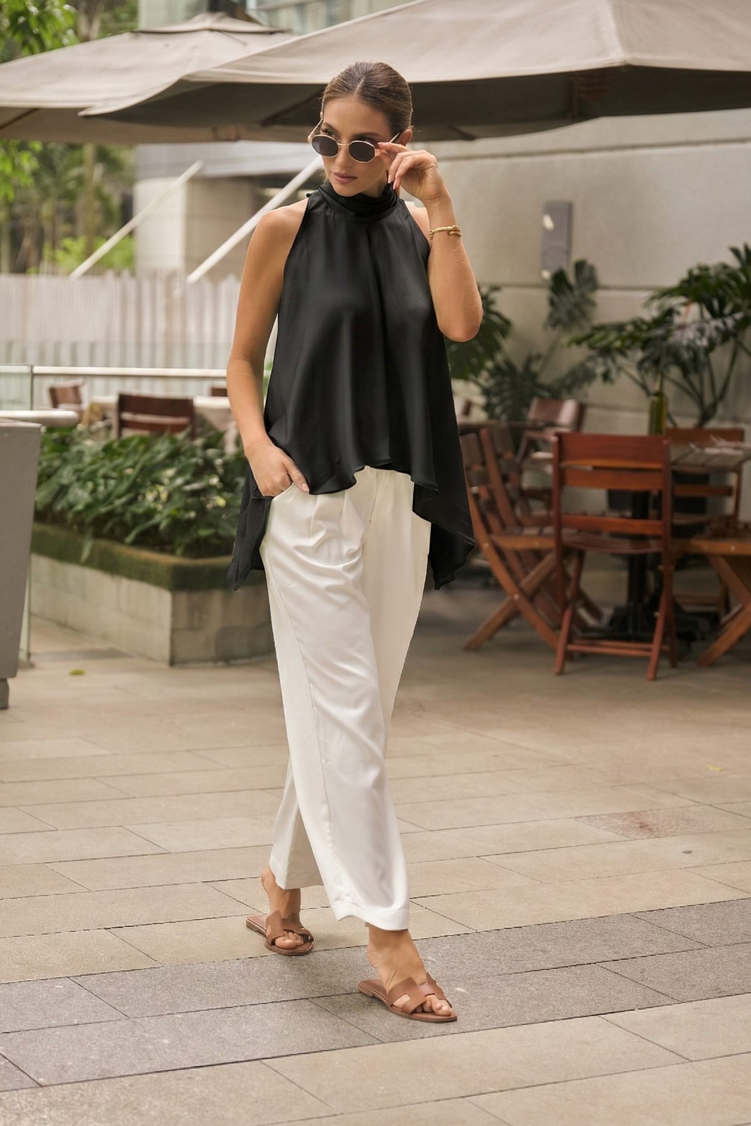 • Camisa cuello halter • Amarre posterior• Caida asimétrica • Tela 100% poliester liviano con brillo.• La modelo está usando TALLA S. (el tallaje es amplio)