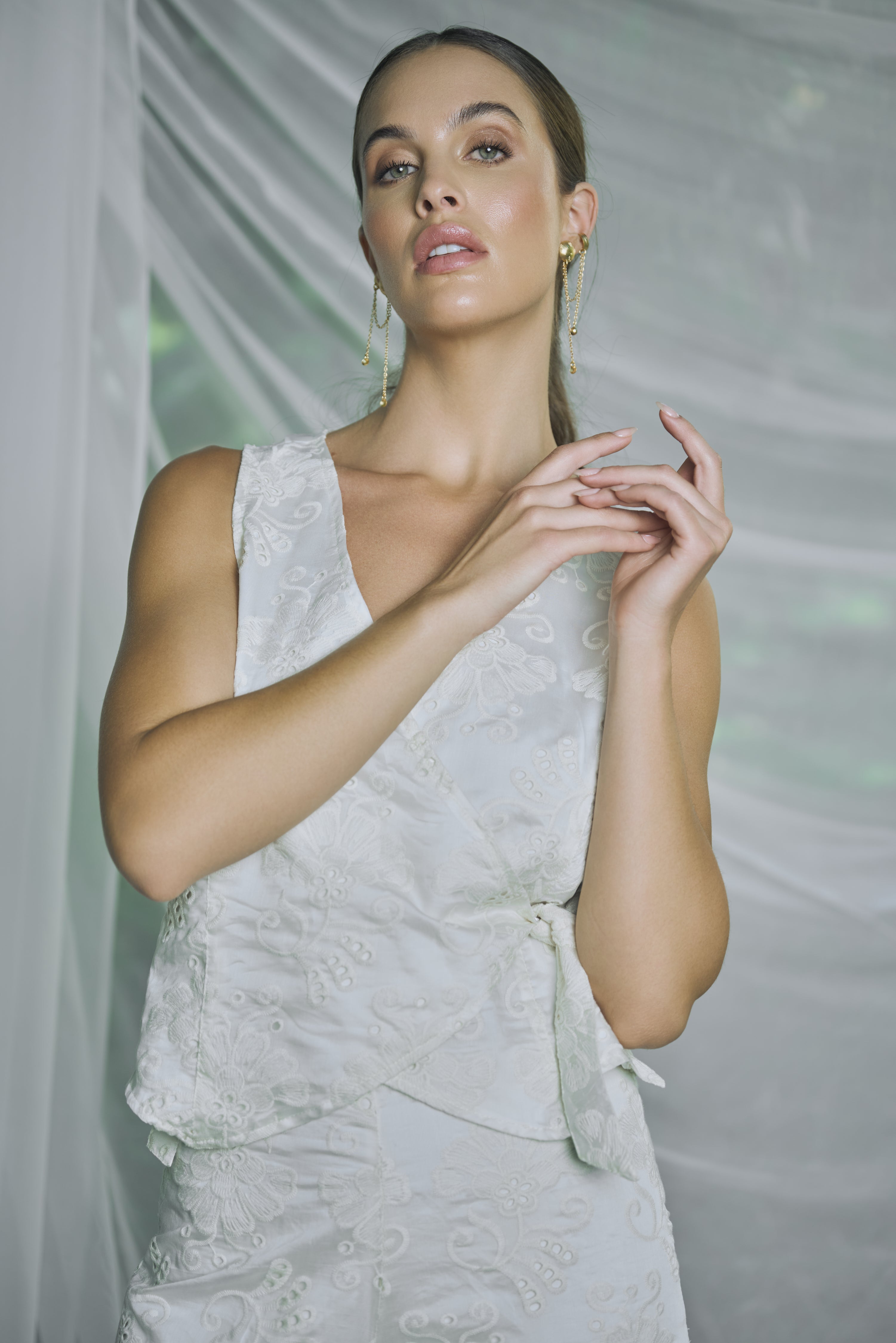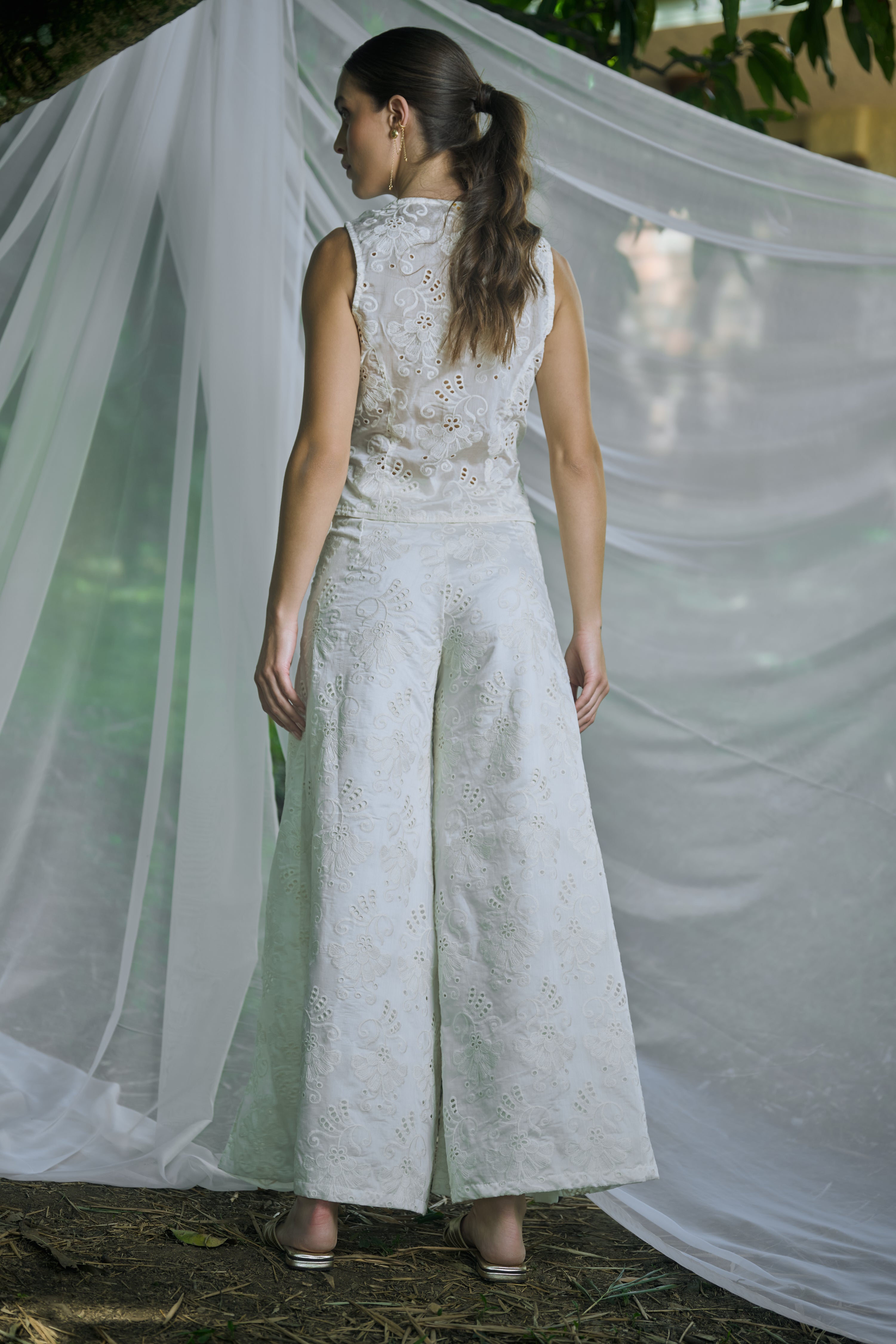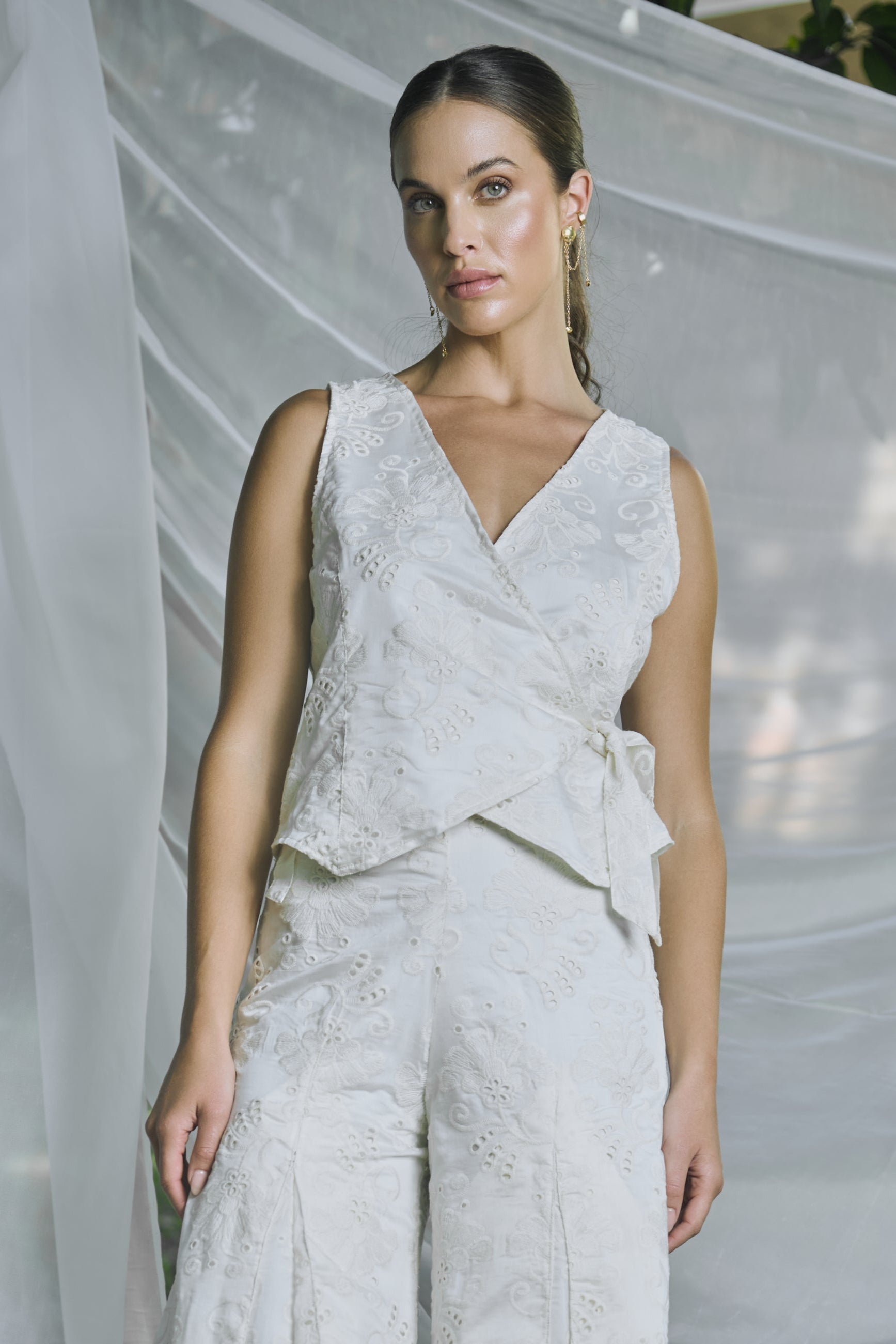 Chaleco sin mangas en encaje bordado marfil, cruzado tipo wrap con escote en “V” y amarre lateral que define la cintura. Femenino y versátil. La modelo usa talla S. Hecho en Colombia. Características: Silueta entallada con ajuste tipo wrap. Escote en “V”; sin mangas. Tejido broderie (encaje bordado) con textura. Largo a la cadera, favorece la cintura. Ideal para coordinar con pantalón mineral como set o denim.