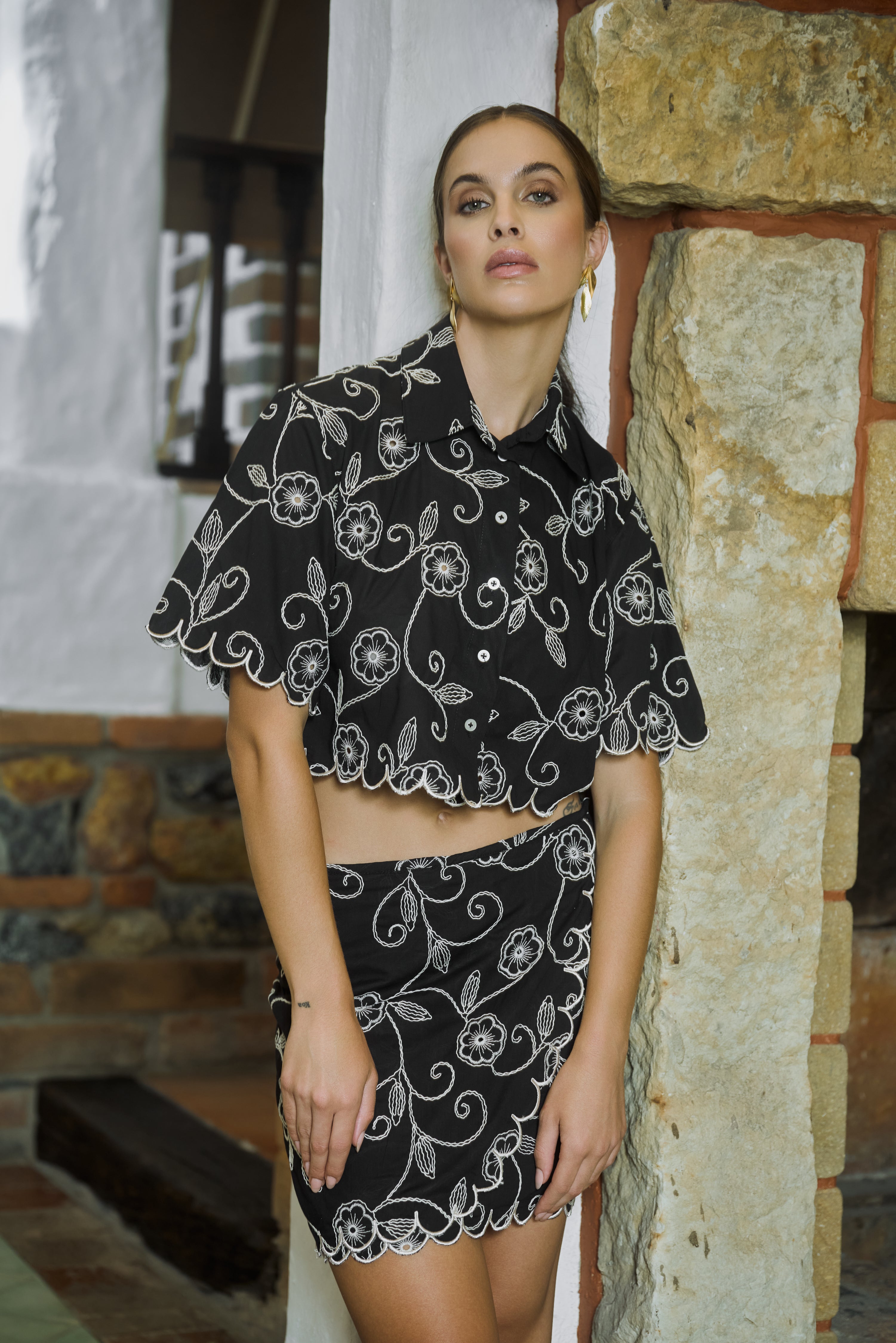 Blusa corta tipo camisera en tejido bordado blanco con contornos exclusivos en los bordes. Manga corta amplia y terminación con moras exclusivas que realza el diseño. La modelo usa talla S. Hecho en Colombia. Características: Silueta corta/relajada tipo crop. Cuello clásico y botonadura frontal. Manga corta amplia. Tejido bordado floral; orilla bordada en mangas y bajo. Ideal para combinar con la falda a juego o denim.