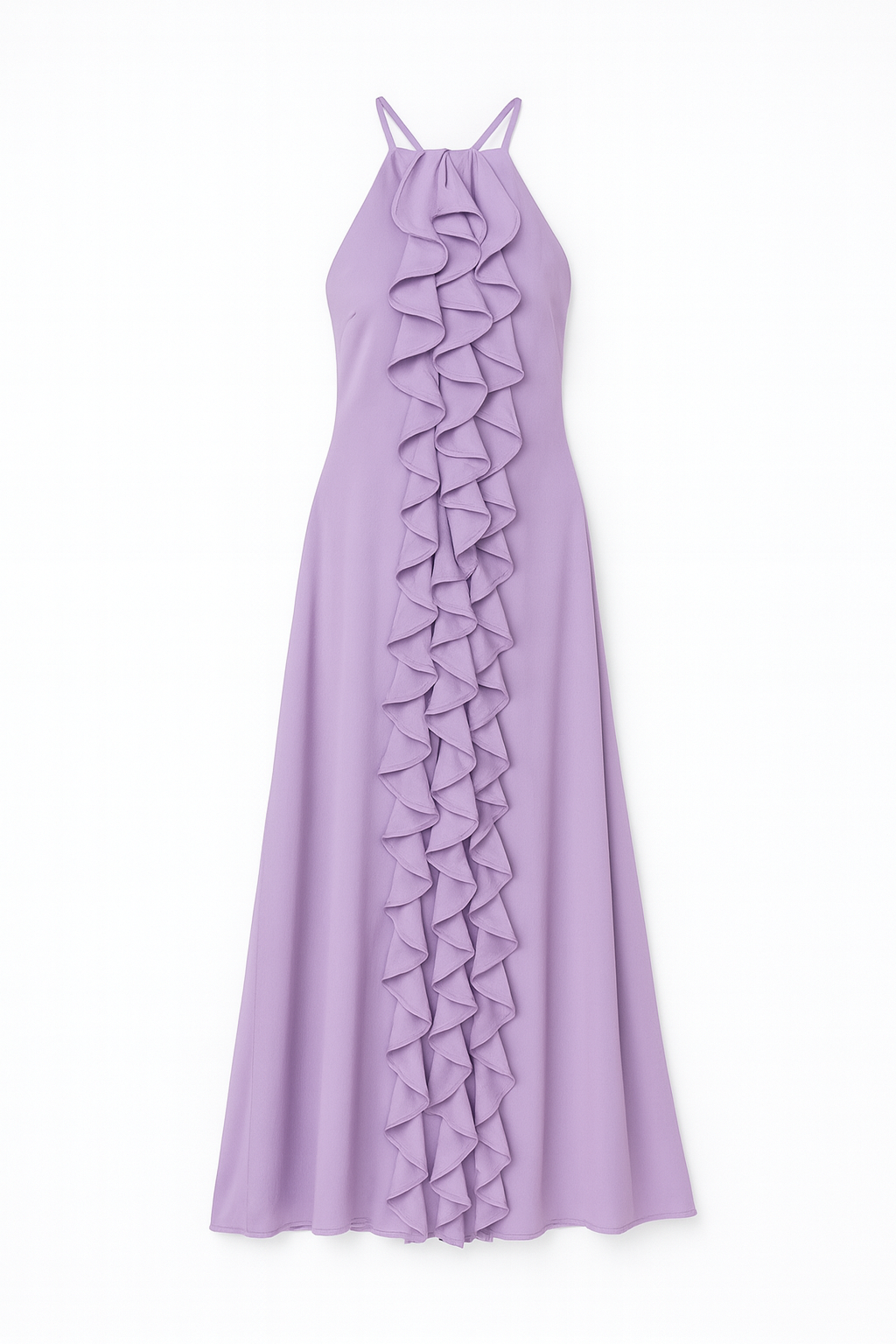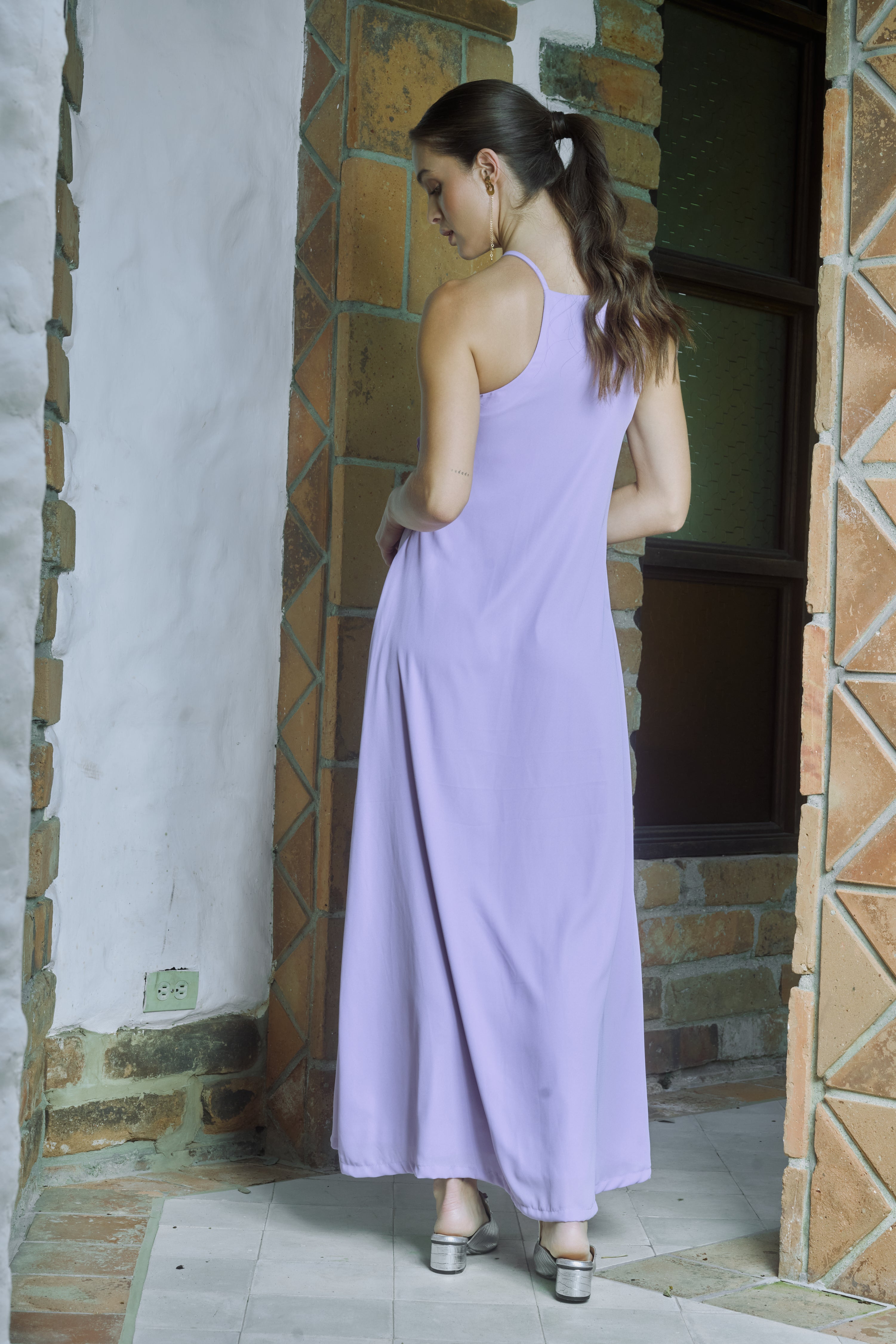 Vestido largo en tono lila con escote halter y caída fluida. Un cascada de volantes al frente aporta movimiento y protagonismo. Sofisticado y cómodo para ocasiones especiales. La modelo usa talla S. Hecho en Colombia. Características: Largo maxi, silueta relajada. Escote halter de tiras delgadas. Volantes en cascada al centro delantero. Tejido ligero con excelente caída. 100% poliester liviano Versatil para eventos de día o noche.