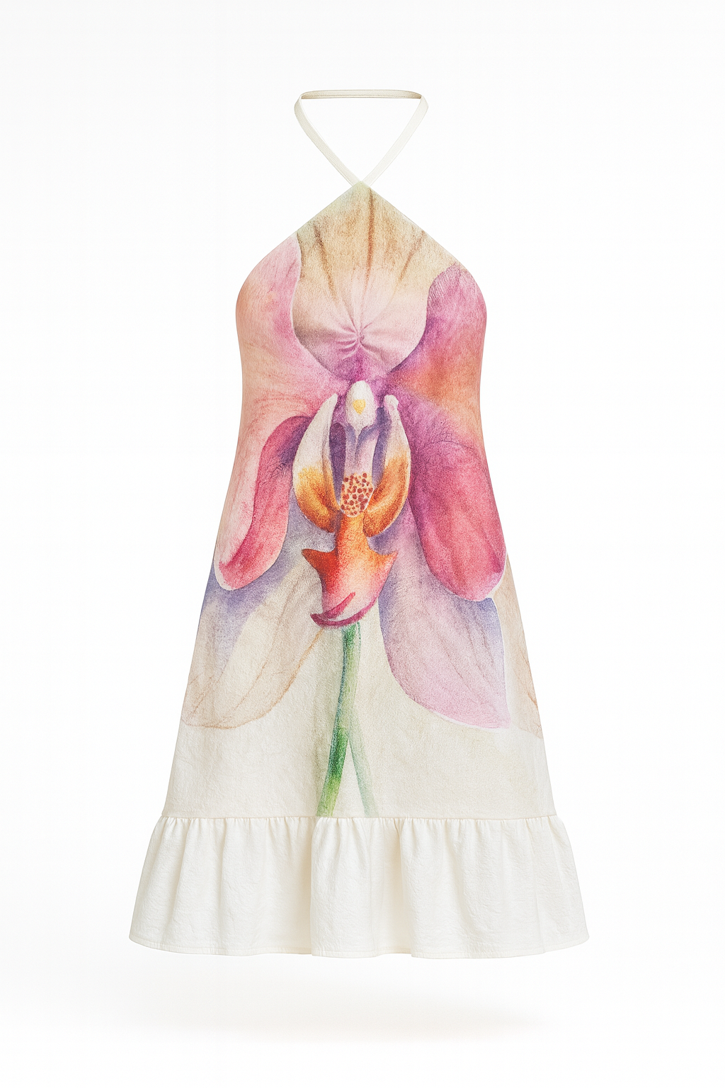 Vestido corto con escote halter y amarre al cuello. Protagonista: orquídea en gran formato al frente, con silueta suelta pero con cuerpo y volante en el bajo que aporta movimiento. Fresco y femenino para el día. La modelo usa talla S. Hecho en Colombia. Características: Largo mini, silueta A relajada. Escote halter con amarre; espalda descubierta. Estampado de orquídea a gran escala. Diseño acuarela Volante ancho en el dobladillo. Tejido ligero con textura sutil y buena caída, tela con Textura y cuerpo.