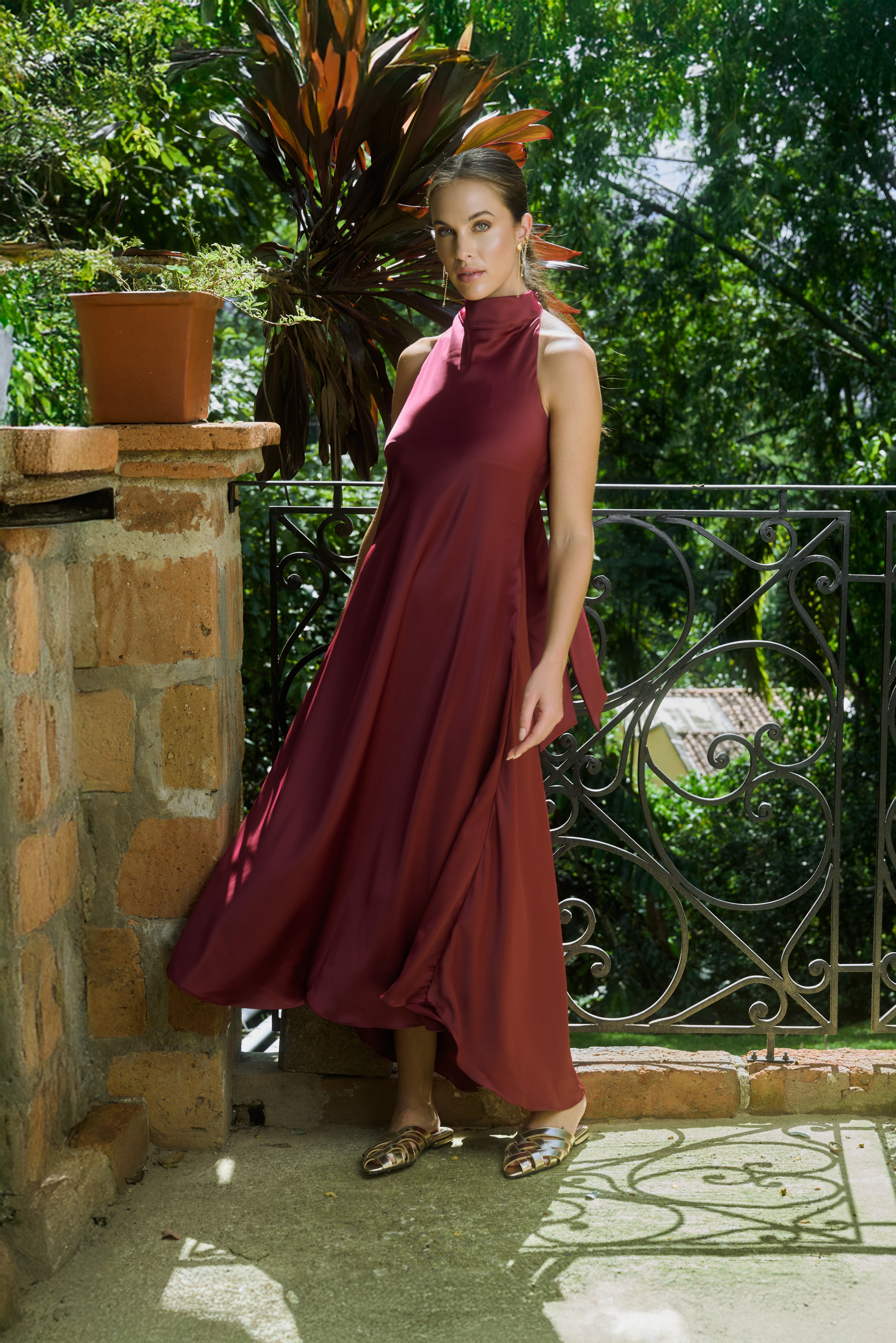 Vestido Largo en tono Vino tinto con leve brillo seda, cuello halter alto y lazo largo que cae por la espalda para graduar el alto de tu cuello. Ceñido en torso y Silueta en A con amplia caída y movimiento para un look elegante y atemporal. La modelo usa talla S. Hecho en Colombia. Características: Largo Tobillo y posterior más largo, falda amplia y fluida. Cuello halter alto con amarre tipo pañuelo en el cuello. Espalda semi descubierta. Tejido satinado de tacto suave y brillo sutil y suficiente estructura para la caida. Ideal para eventos de día o de noche. ...