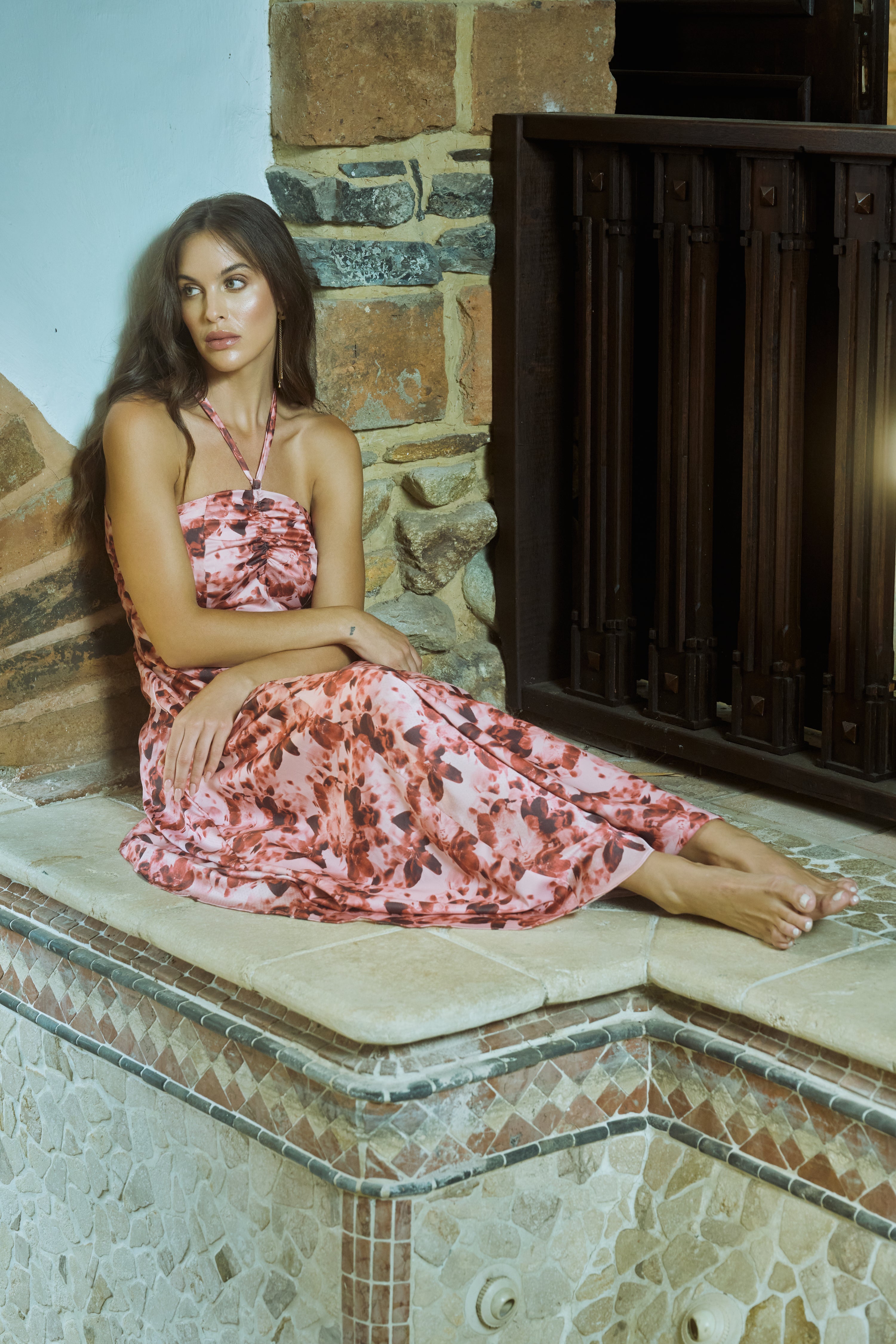 Vestido Largo con estampado floral en tonos rosados. Escote halter con detalle en recogido del busto que estiliza la silueta, espalda descubierta con tiras cruzadas. Falda amplia de caída fluida para un look femenino y versátil. La modelo usa talla S. Hecho en Colombia. Características: Largo silueta en Campana con cortes en falda. Escote halter con detalle fruncido/nudo. Espalda descubierta; tiras delgadas cruzadas. Estampado floral en paleta rosada. Tejido ligero con gran movimiento. Ideal para eventos de día, vacaciones o resort.