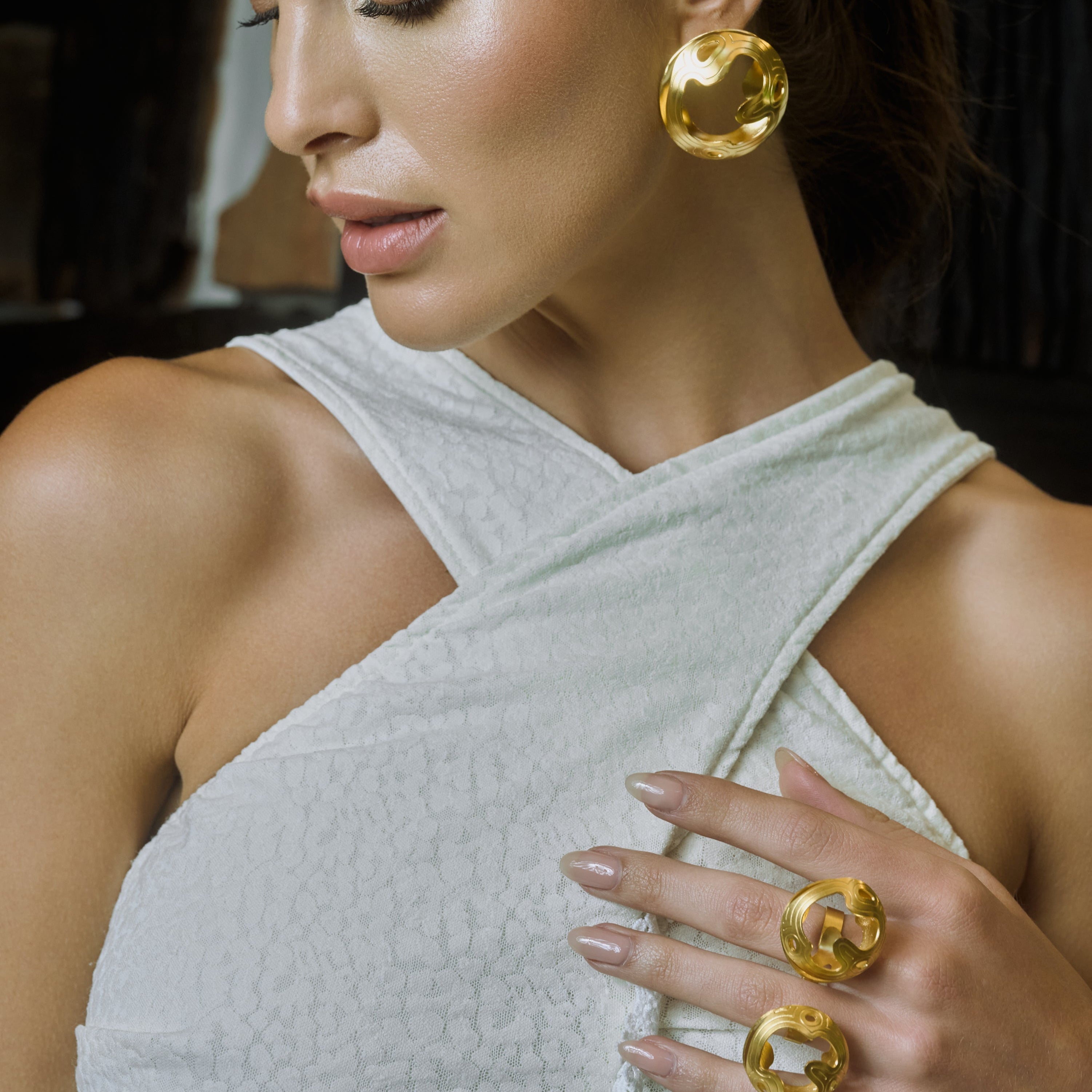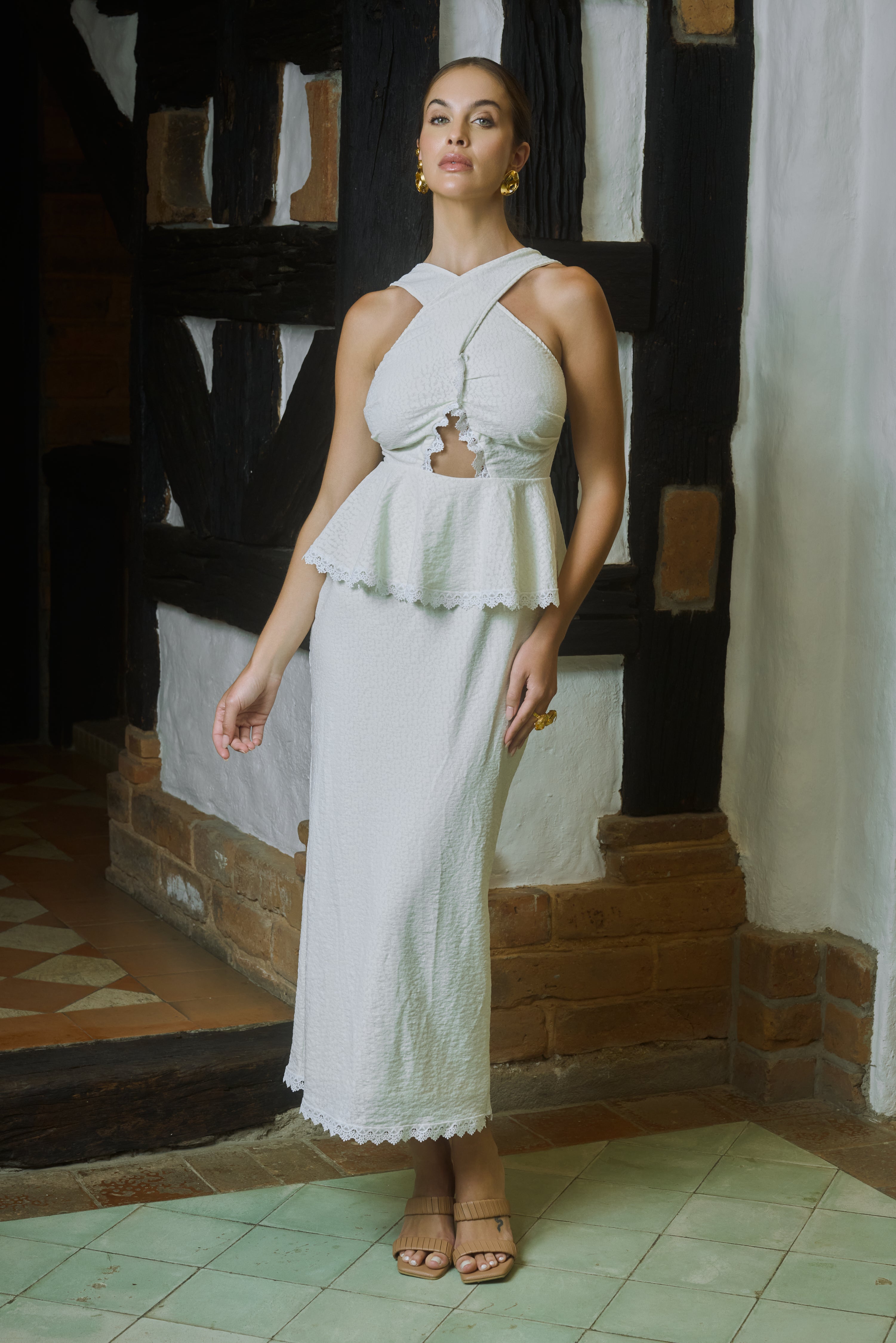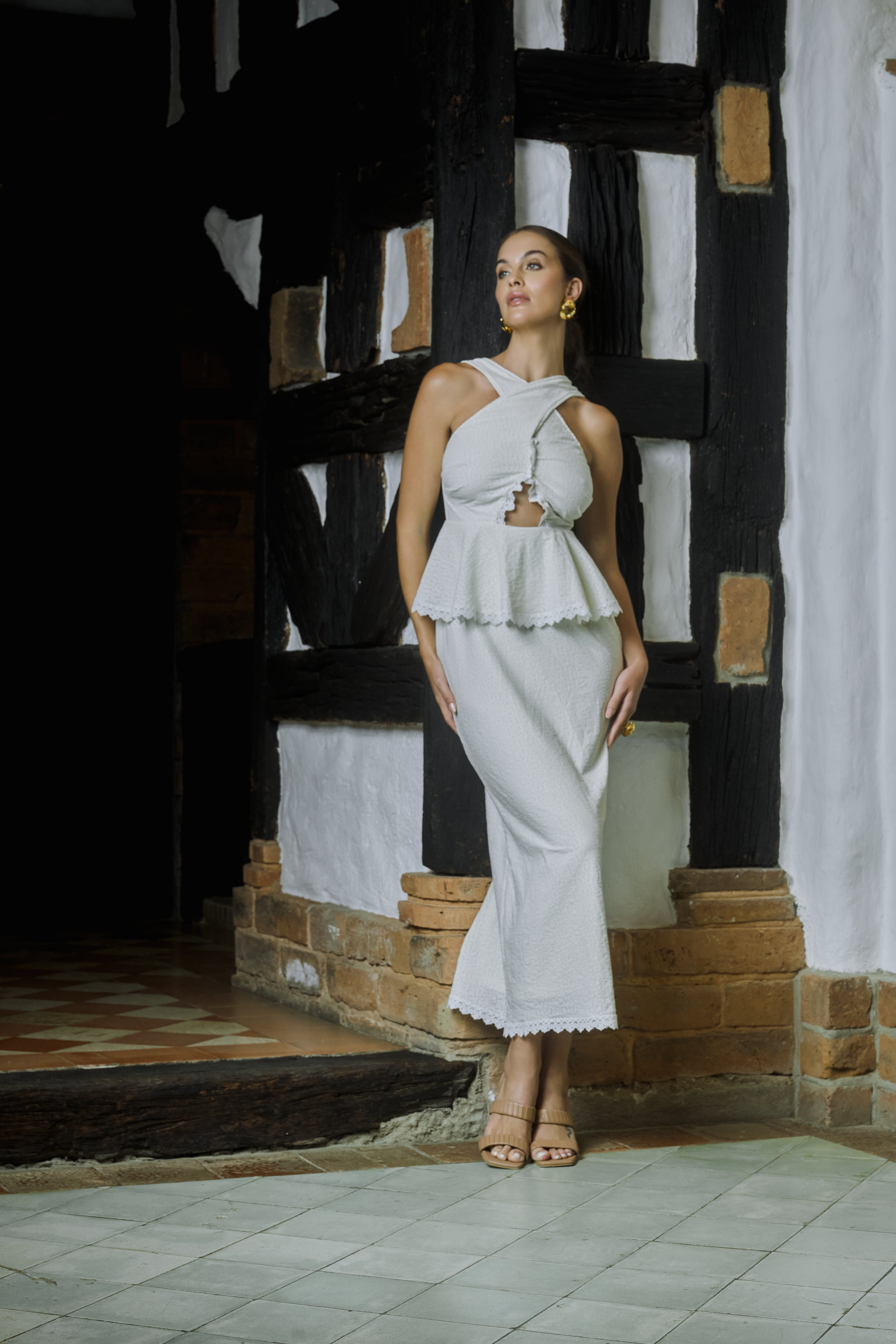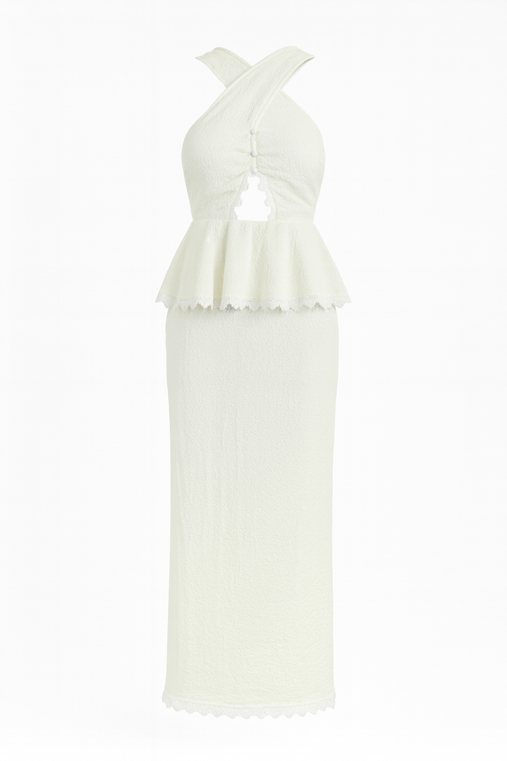 PIEZA ÚNICA Vestido midi color marfil con textura. Escote cruzado en el delantero que forma una abertura central en forma orgánica. Cintura marcada y peplum con delicado ribete de encaje que realza la silueta. Falda recta hasta el tobillo con ruedo en encaje. En la espalda, tirantes anchos, escote bajo y cierre con cremallera invisible. Abertura trasera en la falda para facilitar el paso. Combina muy bien con sandalias nude y aretes dorados. Detalles clave Largo: midi/tobillero Silueta: ceñida en cintura con peplum Cuello: cruzado con cut-out frontal Cierre: cremallera trasera Perfecto para un coctel, o una boda.